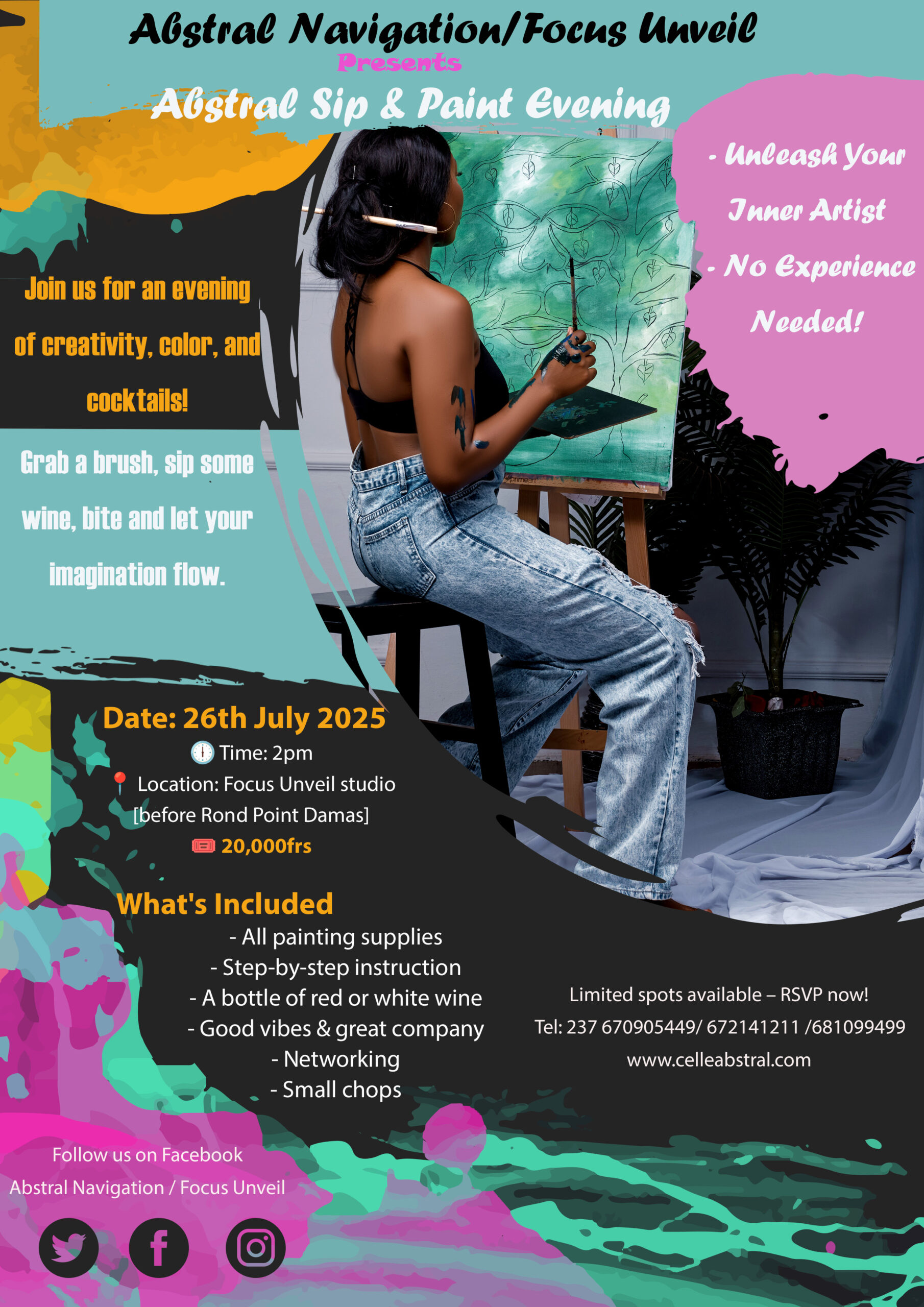 The CelleAbstral arts movement together with focus unveil is organising a painting program that is aimed at increasing people love for the arts. The sip and paint evening are aimed at making it Audience to find pleasure in the world of arts and also to take a journey into themselves to better understand the world of instincts and see how they can use this better alienate with themselves. Come and share your artistic qualities with us as we share ours with you. Together we can navigate into our experiences to better understand ourselves and the community that makes us one.